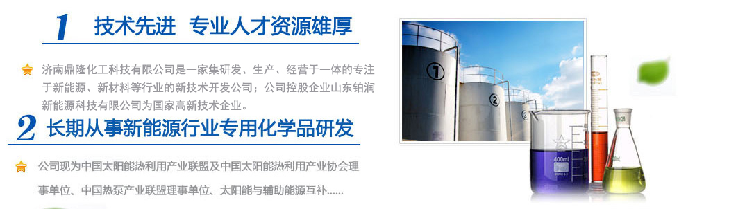 濟(jì)南鼎隆化工科技有限公司是一家集研發(fā)、生產(chǎn)、經(jīng)營(yíng)于一體的專注于新能源、新材料等行業(yè)的新技術(shù)開(kāi)發(fā)公司;公司控股企業(yè)山東鉑潤(rùn)新能源科技有限公司為國(guó)家高新技術(shù)企業(yè)。擁有雄厚的科研實(shí)力和專業(yè)銷售隊(duì)伍以及多名從事化學(xué)化工專業(yè)的高素質(zhì)人員,其中博士生導(dǎo)師1人,碩士研究生3人。公司現(xiàn)為中國(guó)太陽(yáng)能熱利用產(chǎn)業(yè)聯(lián)盟及中國(guó)太陽(yáng)能熱利用產(chǎn)業(yè)協(xié)會(huì)理事單位、中國(guó)熱泵產(chǎn)業(yè)聯(lián)盟理事單位、山東清潔能源供暖產(chǎn)業(yè)聯(lián)盟理事單位、太陽(yáng)能與輔助能源互補(bǔ)供熱/制冷工程專業(yè)委員會(huì)會(huì)員單位。公司專注于綠色科技,專業(yè)化研發(fā)環(huán)境友好型化工產(chǎn)品,與眾多高校和國(guó)內(nèi)外多家著名化學(xué)品公司保持戰(zhàn)略合作關(guān)系。公司擁有“載能”和“澤能”...更多